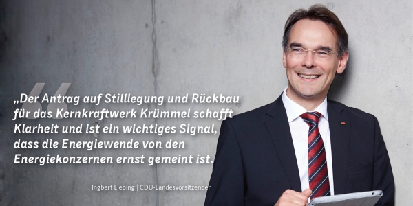 Der gestern gestellte Antrag auf Stilllegung und Rückbau für das Kernkraftwerk Krümmel schafft Klarheit", bewertet der CDU-Landesvorsitzende Ingbert Liebing den Vorstoß des Betreibers Vattenfall. Der Schritt komme nicht überraschend. Es sei damit zu rechnen gewesen, da der Meiler bereits seit 2007 stillstehe.