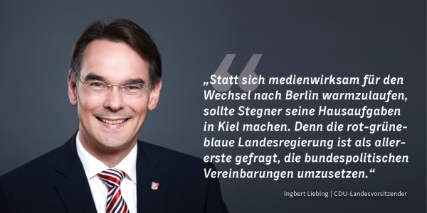 "Das letzte, was Deutschland braucht, ist ein neuer Dauerstreit in der SPD zwischen Stegner und Gabriel. Statt sich medienwirksam für den Wechsel nach Berlin warmzulaufen, sollte Stegner seine Hausaufgaben in Kiel machen. Denn die rot-grüne-blaue Landesregierung ist als allererste gefragt, wie von Stegner gefordert die bundespolitischen Vereinbarungen umzusetzen - wenn sie das endlich täte, würde sich vor Ort bereits eine spürbare Entspannung einstellen", sagte der CDU-Landesvorsitzende Ingbert Liebing heute (11.01.2016) in Kiel.